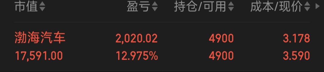 $渤海汽车(SH600960)$ 我是上次大盘跌3200以下逐步建仓的,买了就不用看了。这个票我目前就是低位买,之后只要低于我成本价,就按一定比例加仓,只买不卖。还是前面说的,不用天天盯盘,今天的大涨我也是刚看到,也没T,无所谓。做时间的朋友,把精力放到生活上来,投资而不是投机。等渤海汽车4.2,这不轻轻松松30个点?如果能过5.56,那不轻轻松松75个点?这股适合慢慢来。