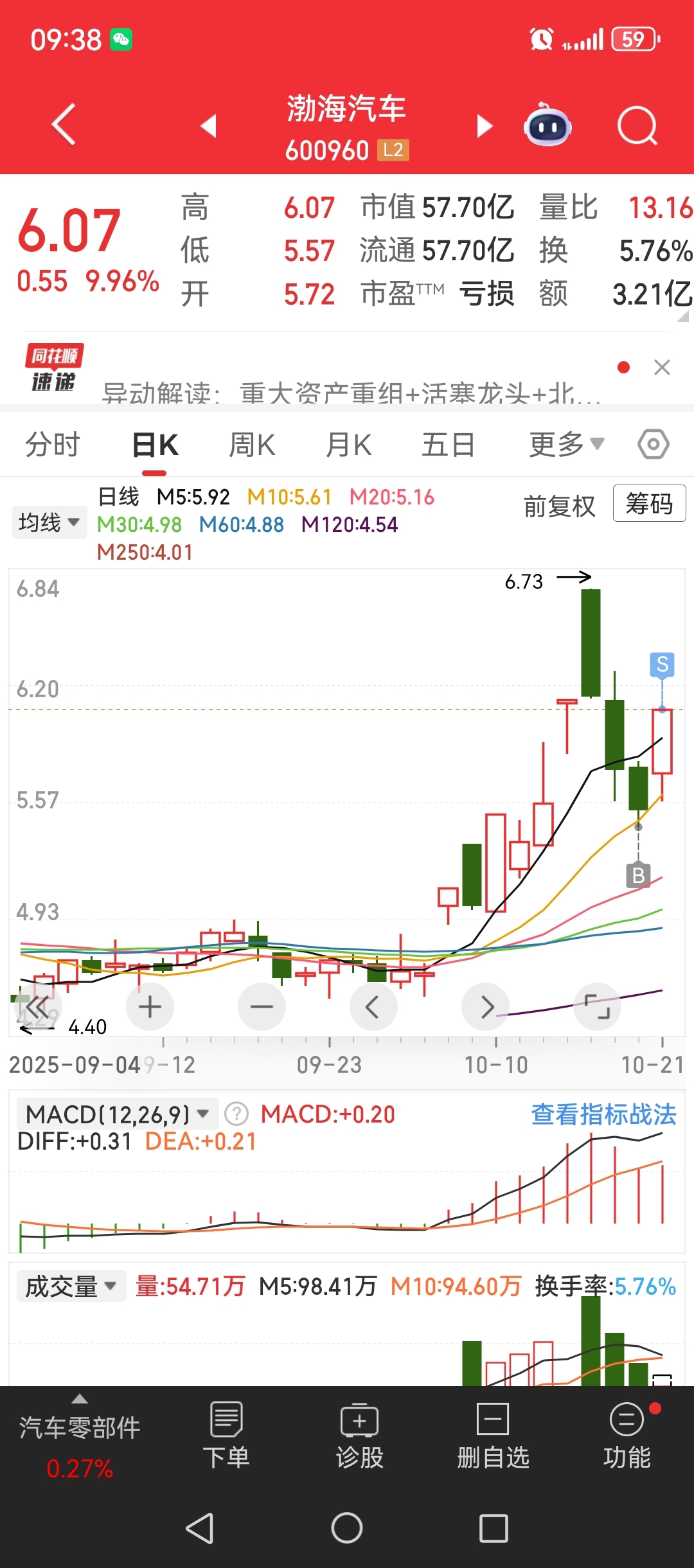 $渤海汽车(SH600960)$ 股友们,看看渤海汽车这种技术形态的票,上涨趋势,回踩10日均线建仓,跌破止损,不跌破就持股。我昨天尾盘建仓渤海汽车,今天涨停清仓,收益也不错,你们可以参考一下这种类型的超短标的。