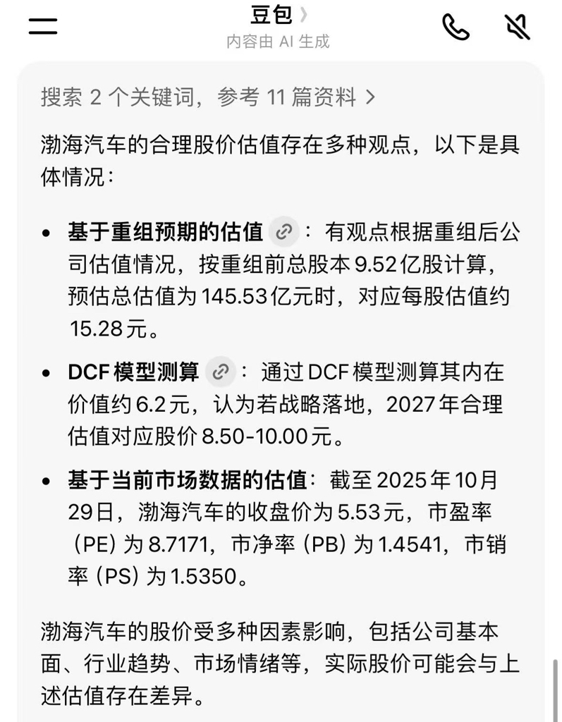 $渤海汽车(SH600960)$ 豆包说的3倍15块