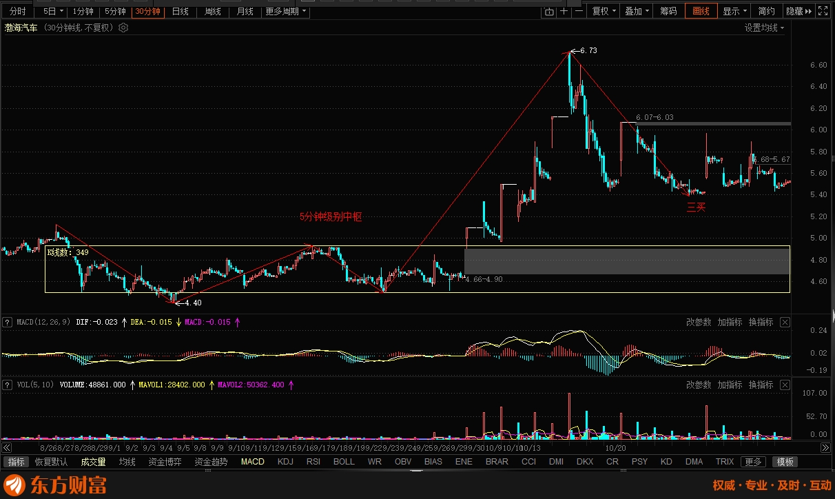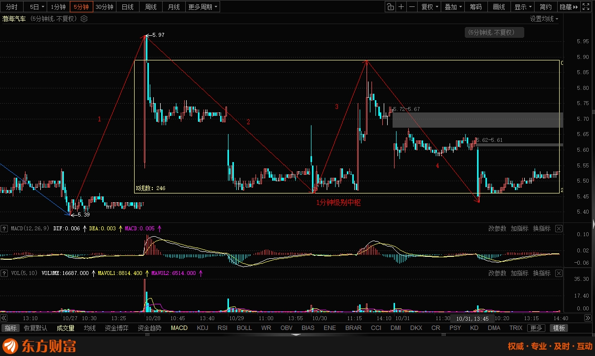30分钟回调一笔不破前高,5分钟级别中枢上方,三买确立。当前位置构建1分钟级别中
