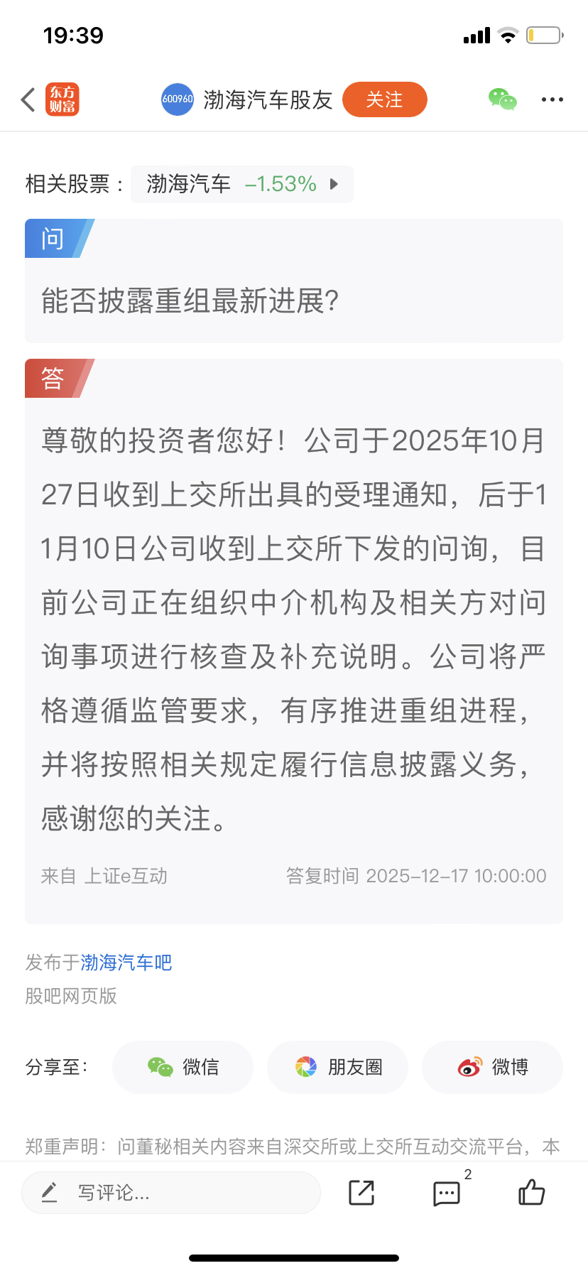$渤海汽车(SH600960)$ 问询已经超过10个交易日了,还不答复吗?