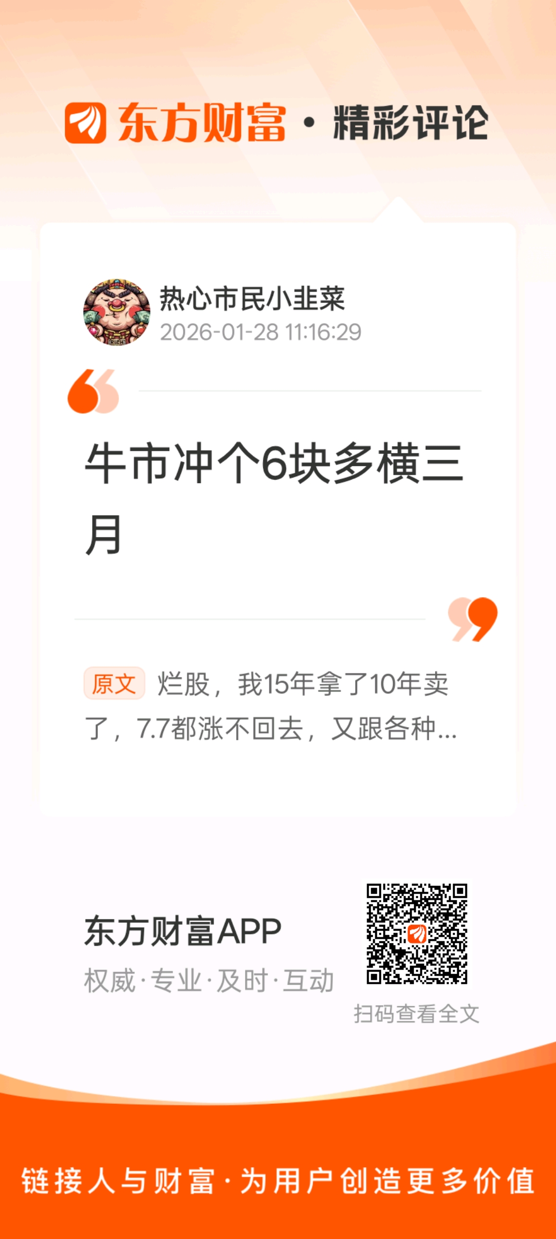温馨提示: 1.根据《证券法》规定,禁止编造、传播虚假信息或者误导性信息,扰乱证券市场;2.用户在本社区发表的所有资料、言论等仅代表个人观点,与本网站立场无关,不对您构成任何投资建议。用户应基于自己的独立判断,自行决定证券投资并承担相应风险。《东方财富社区管理规定》