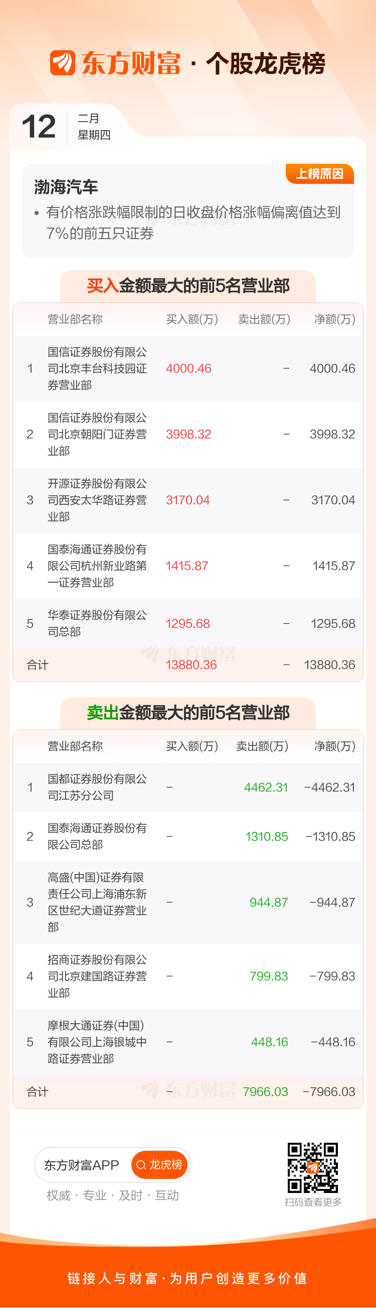 交易所2026年2月12日公布的交易公开信息显示,渤海汽车因成为有价格涨跌幅限制的日收盘价格涨幅偏离值达到7%的前五只证券上榜。渤海汽车当日收报5.67元,涨跌幅10.10%,偏离值10.05%,换手率7.39%,成交额3.87亿。