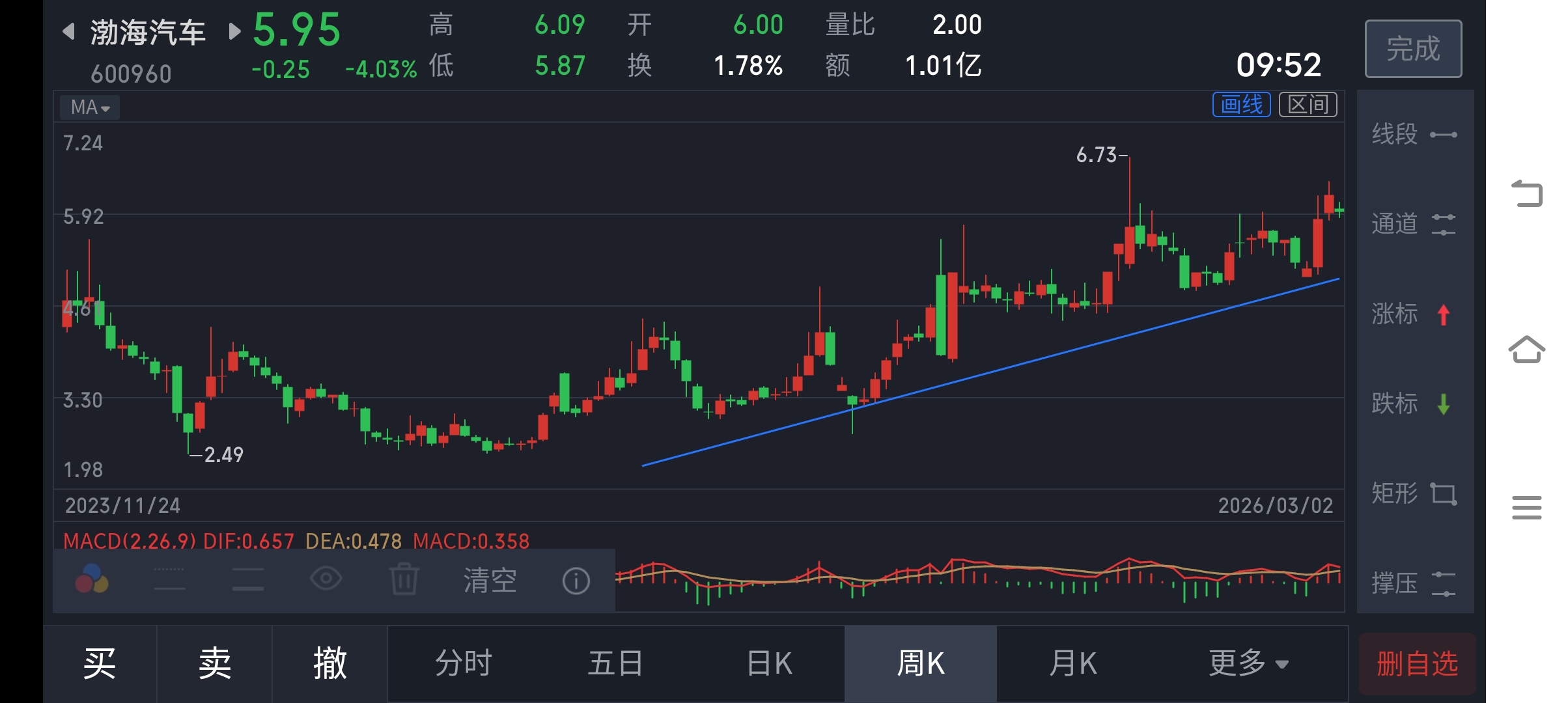 $渤海汽车(SH600960)$ 再简单说说这只,前几天提示过此股,目前到了加速的最后酝酿阶段,这次回调应该是大行情启动前最后一次回调,把周线前面的低点画一条线应该就是此次回调的极限位,完事后面应该会有一波不错的行情,估计周三附近可以考虑要不要参与了,之所以说这只感觉此股后期潜力也不小,后期关注一下就是了