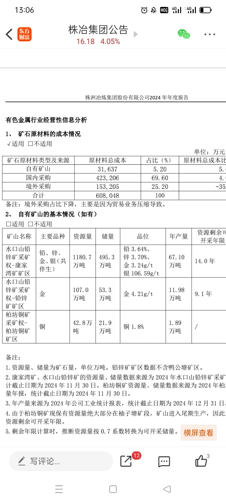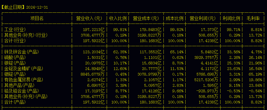 2024年报里面,金锭和银锭的利润占比近50%,锌利润占比33%,半导体行业用的铟锭(产品)利润也有5700万元。水 口山采矿区金、银、铜、锌的的资源储量也很高。