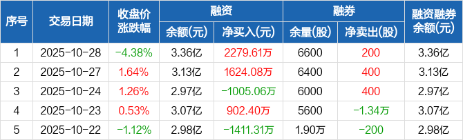融资方面,当日融资买入6769.27万元,融资偿还4489.65万元,融资净买入2279.61万元。融券方面,融券卖出800股,融券偿还600股,融券余量6600股,融券余额9.79万元。融资融券余额合计3.36亿元。