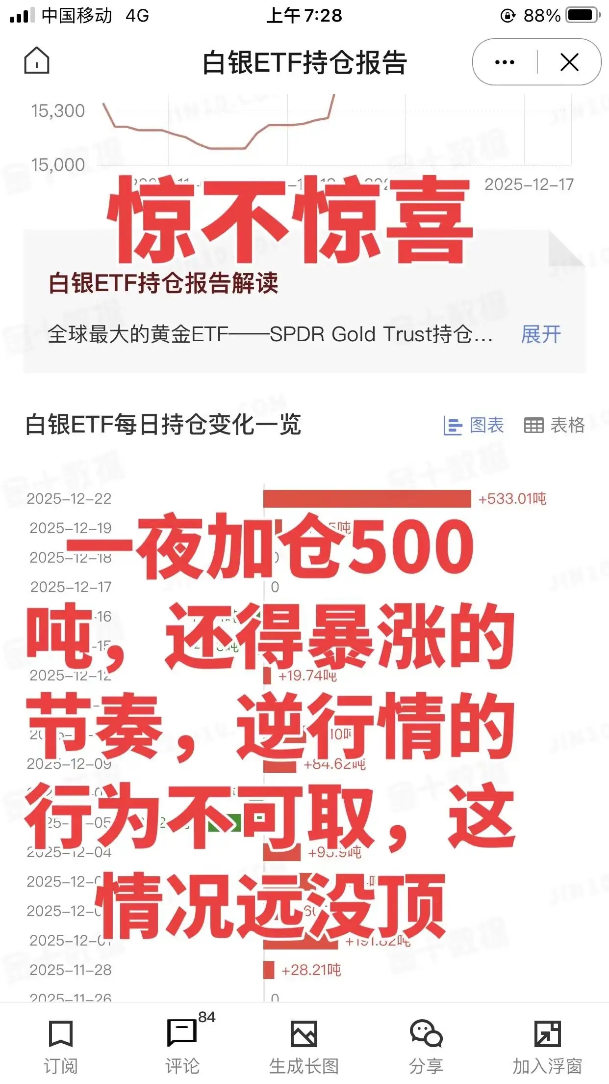 一夜加仓500吨白银,黄金加仓12吨。一夜加仓500吨白银,12吨黄金,这是有大