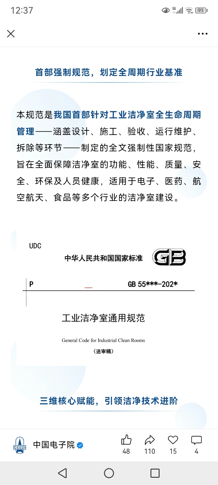 近日,中国电子院主编的我国首部针对工业洁净室全生命周期管理强制性工程建设国家规范