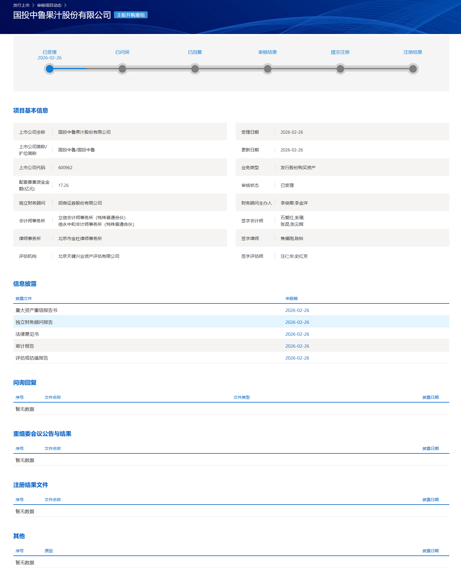 上交所:国投中鲁果汁股份有限公司,并购重组最新状态。