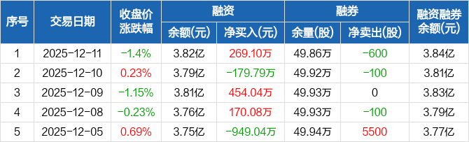 融资方面,当日融资买入1062.9万元,融资偿还793.8万元,融资净买入269.1万元。融券方面,融券卖出100股,融券偿还700股,融券余量49.86万股,融券余额211.41万元。融资融券余额合计3.84亿元。