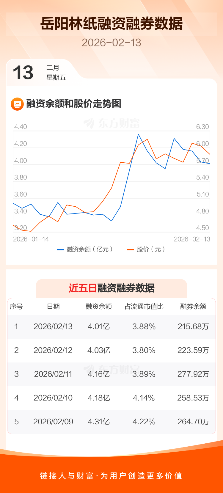 交易所最新数据显示,岳阳林纸于2026年2月13日获融资买入5627.31万元,融资偿还5780.41万元,当日融资净偿还153.1万元。目前,该股融资余额4.01亿,占流通市值比例为3.88%。