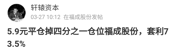 6元平仓掉四分之一仓位福成股份,套利77.5%(包含股息)