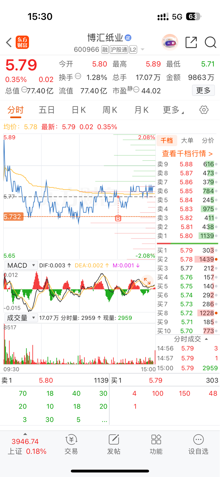 $博汇纸业(SH600966)$ 今天加仓了,庄家高抛低吸,低位还是有承接的,并没有一味的下探要更多低位筹码,还能借大盘震荡洗一波,挺好,仅个人观点,欢迎相互探讨