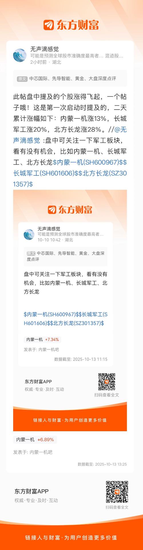 此帖盘中提及的个股涨得飞起,一个帖子哦!这是第一次启动时提及的,二天累计涨幅如下:内蒙一机涨13%,长城军工涨20%,北方长龙涨28%。//@无声滴感觉 :盘中可关注一下军工板块,看有没有机会,比如内蒙一机、长城军工、北方长龙$内蒙一机(SH600967)$$长城军工(SH601606)$$北方长龙(SZ301357)$