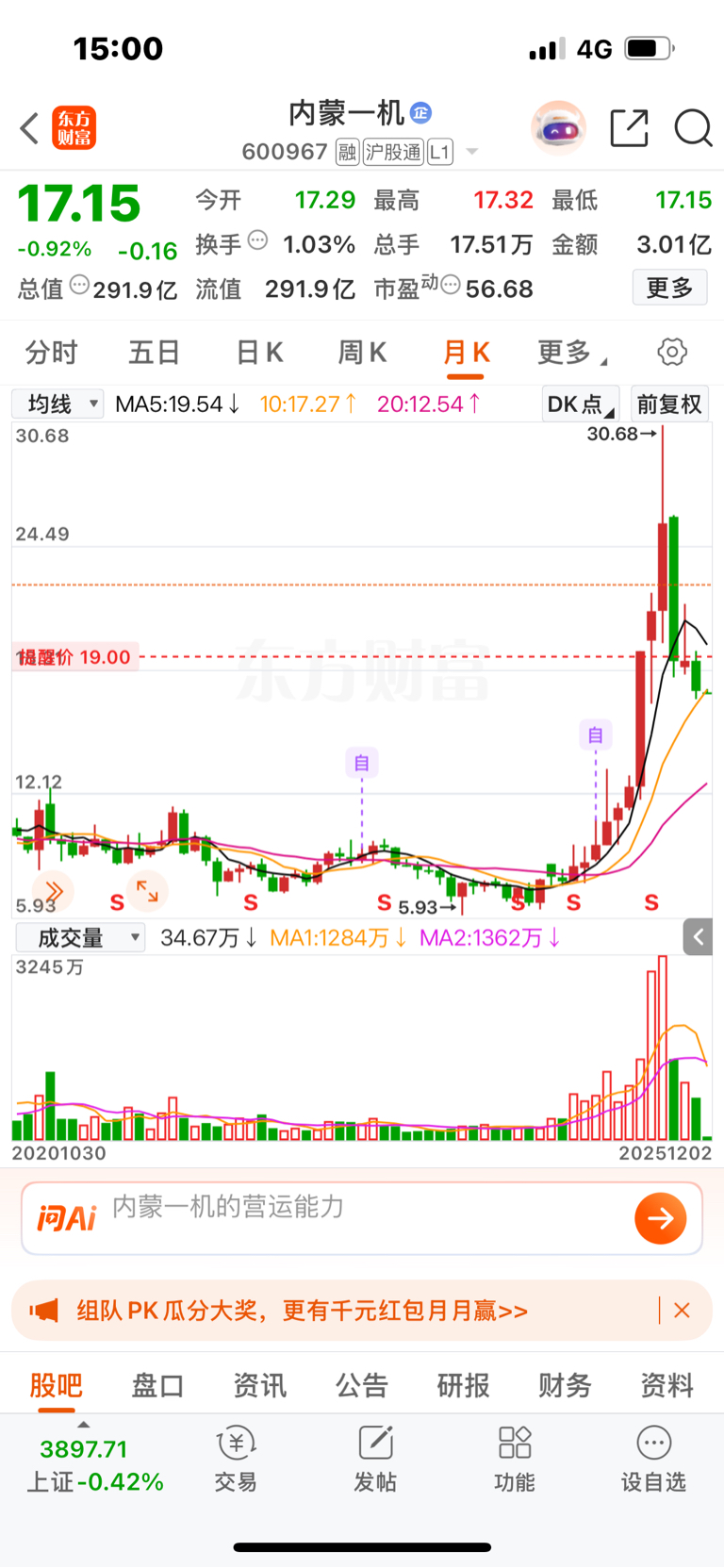 $内蒙一机(SH600967)$ 月线级别,黄色线破了,说明还不是支撑,继续下探,继续等