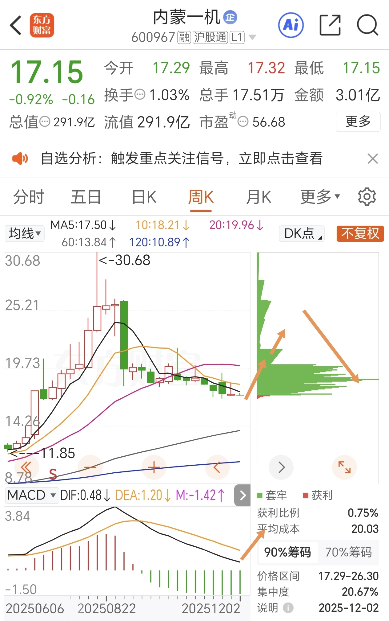 $内蒙一机(SH600967)$ 预判大概是这个走势,本周继续震荡,下周开始拉升,MACD周线即将拐头形成金叉。