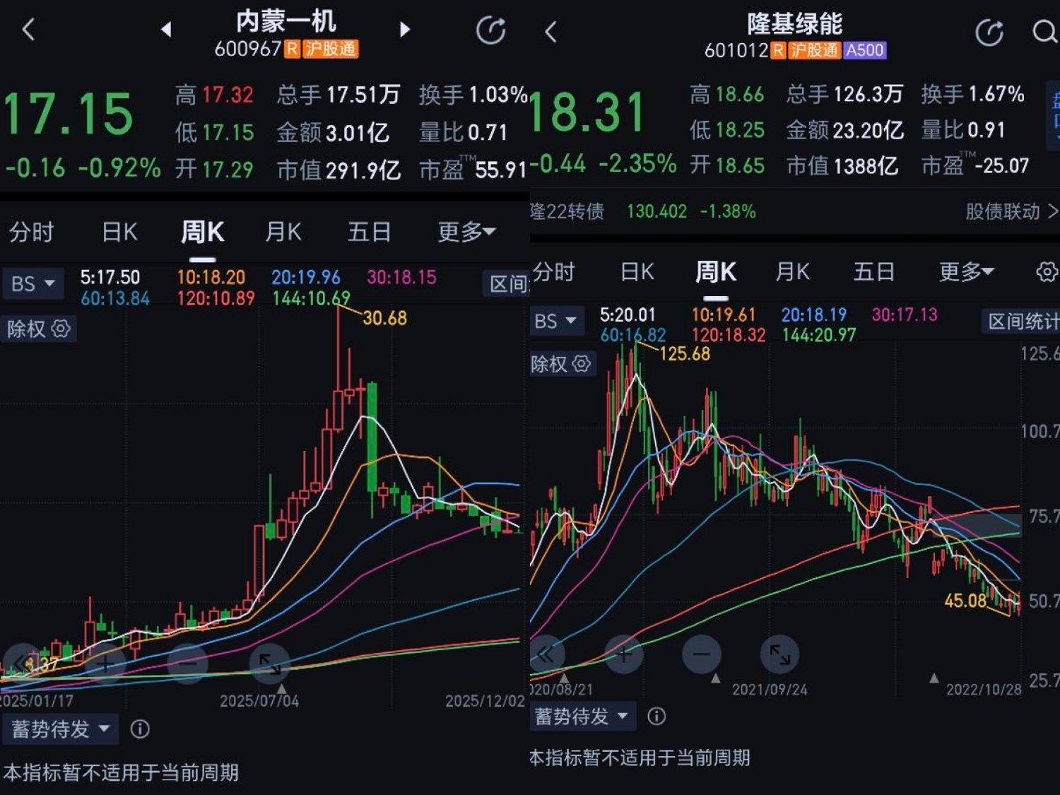 看下内蒙和隆基的周线对比,隆基在下跌过程中反弹幅度达到50%,再看看内蒙周线10