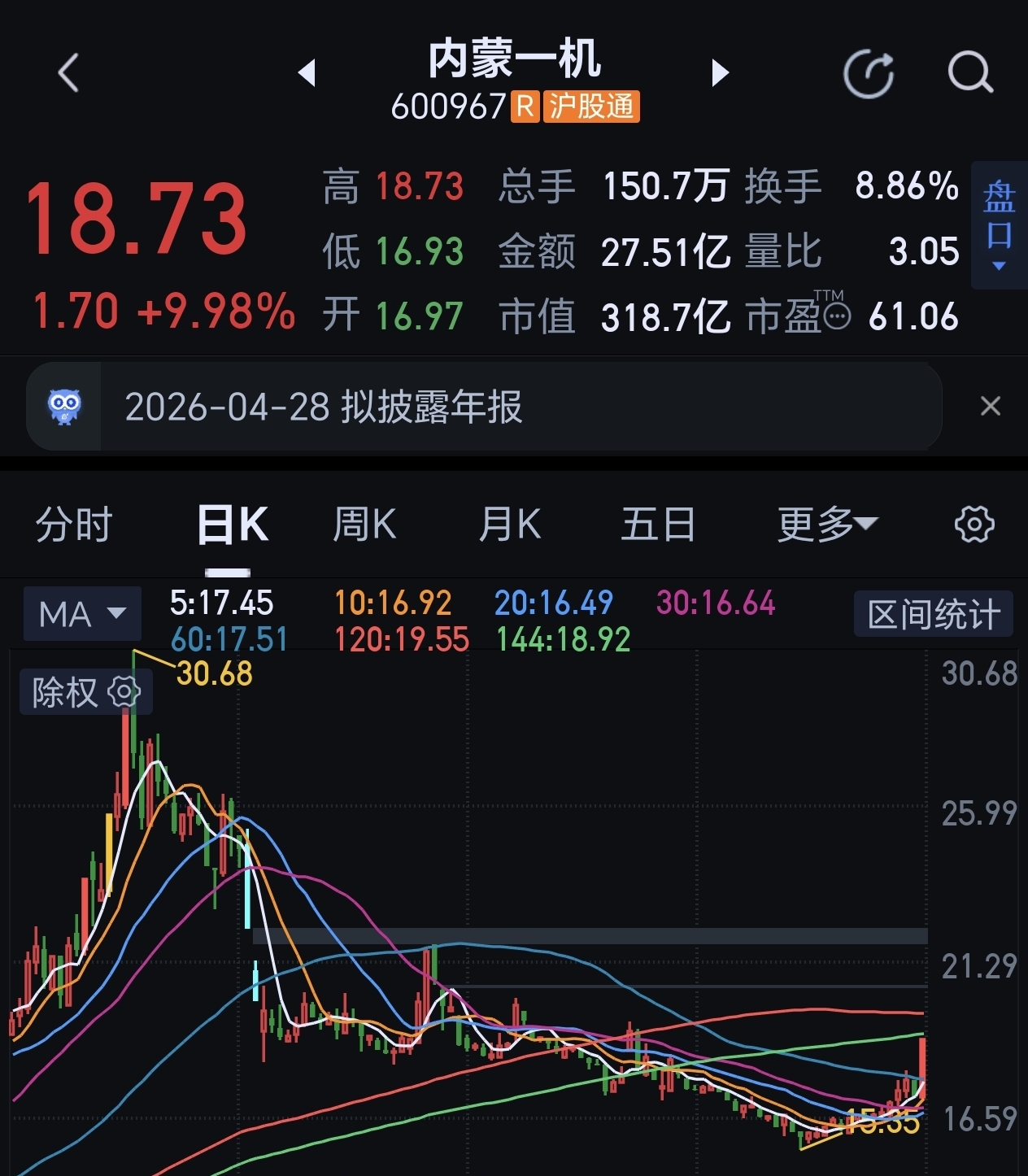 $内蒙一机(SH600967)$ 今天是个大大的惊喜,原本希望能有个反包站上60日线就满足了,没想到能放量封板领涨。明作:继续看好,若能涨停补齐第一个小缺口并突破120日及144日均线就漂亮了。