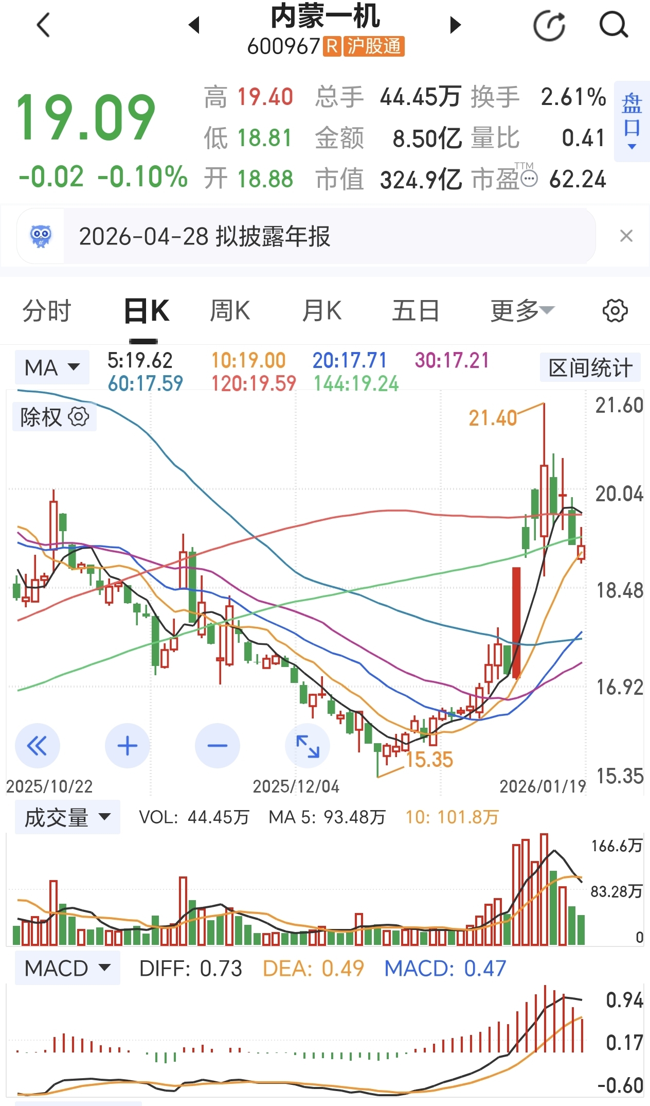$内蒙一机(SH600967)$ 今日全天缩量走弱,跑输大盘和板块。盘中量化突然拉升但尽显乏力。5日线有下穿半年线之势。虽然收盘站稳10日线上方,但从各种指标来看明日应会延续调整姿态。后市操作:基本面未变,长期仍然看好。短期延续调整姿态,可以择机做T。下一支撑位看18.73。