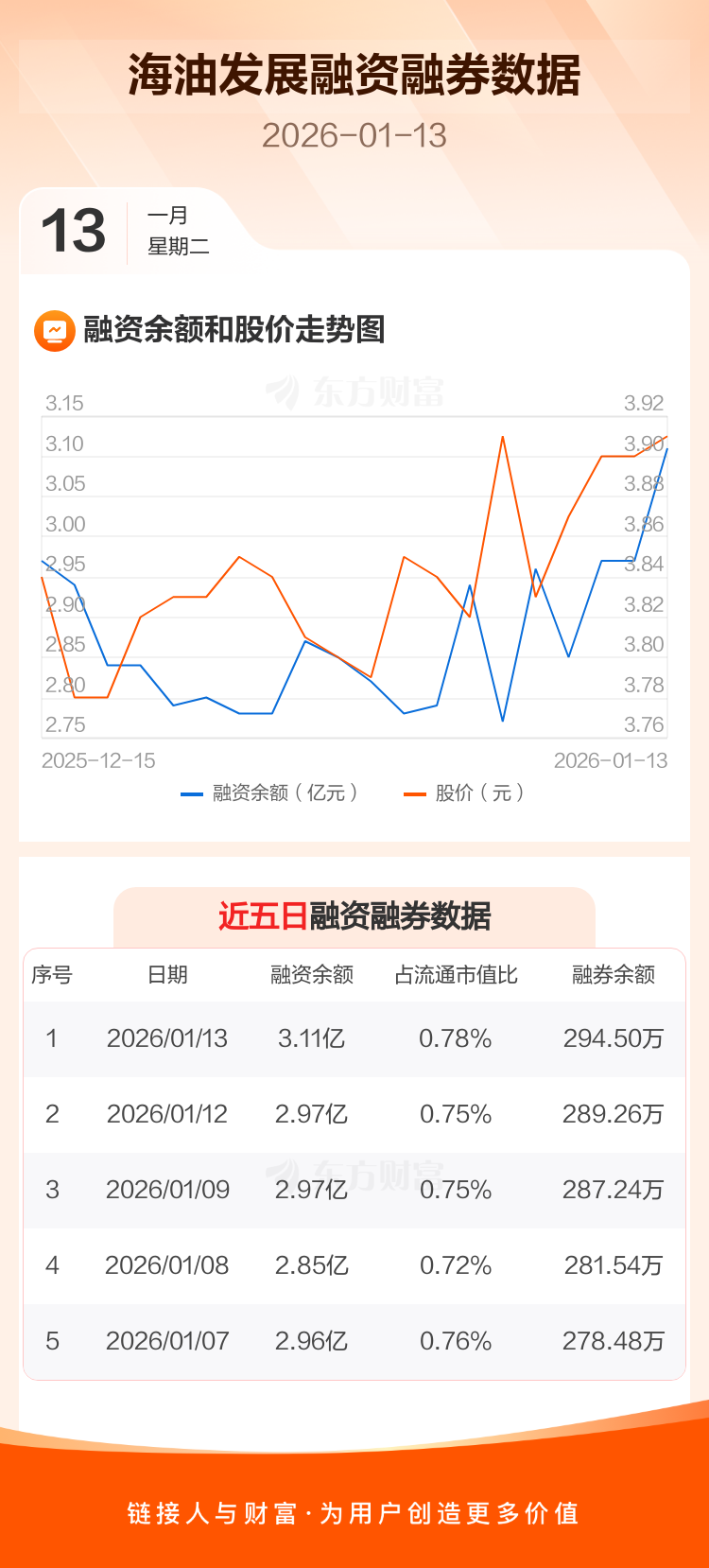 交易所最新数据显示,海油发展于2026年1月13日获融资买入4056.72万元,融资偿还2708.00万元,当日融资净买入1348.72万元。目前,该股融资余额3.11亿,占流通市值比例为0.78%。