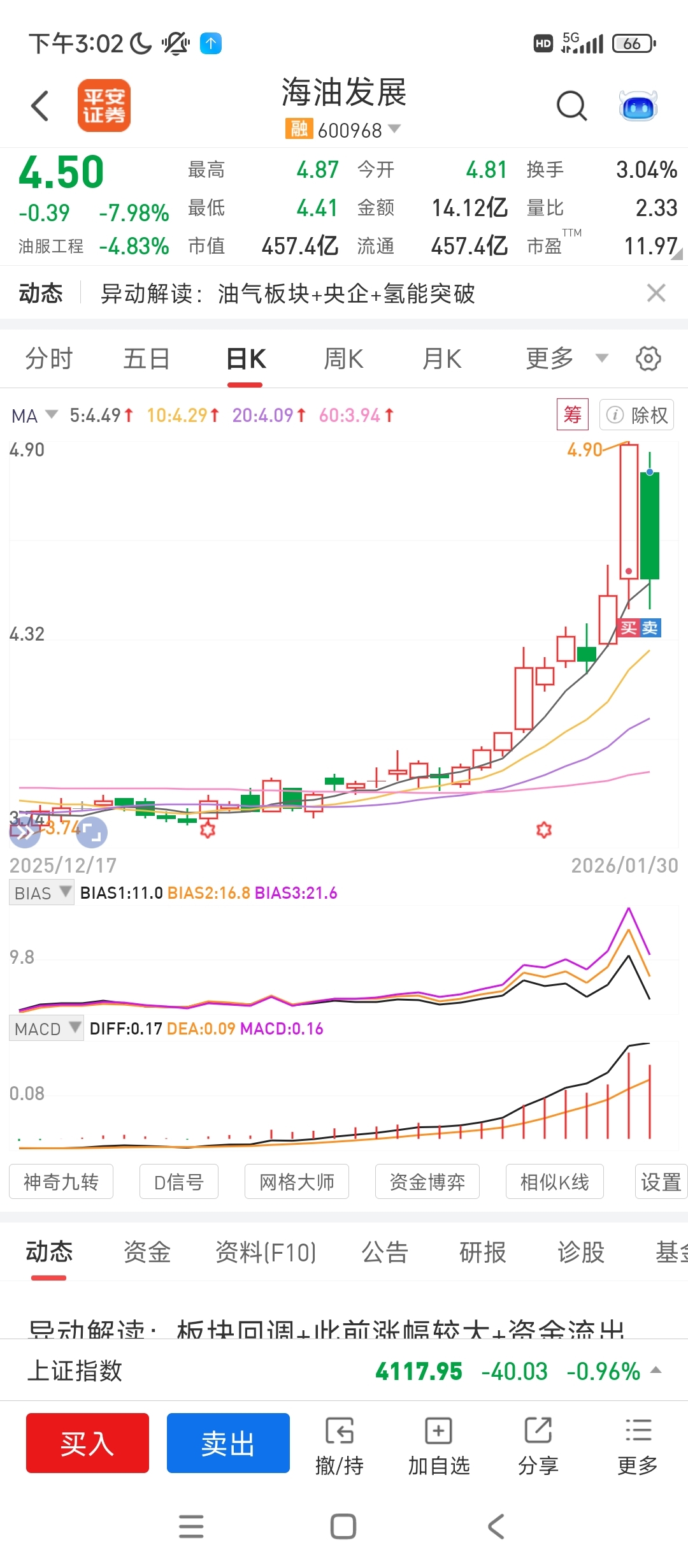 $海油发展(SH600968)$ 做了个板块后排小弟,套利成功 昨日早盘买入,可惜了拉了尾盘没封住,今日竞价25分直接卖出