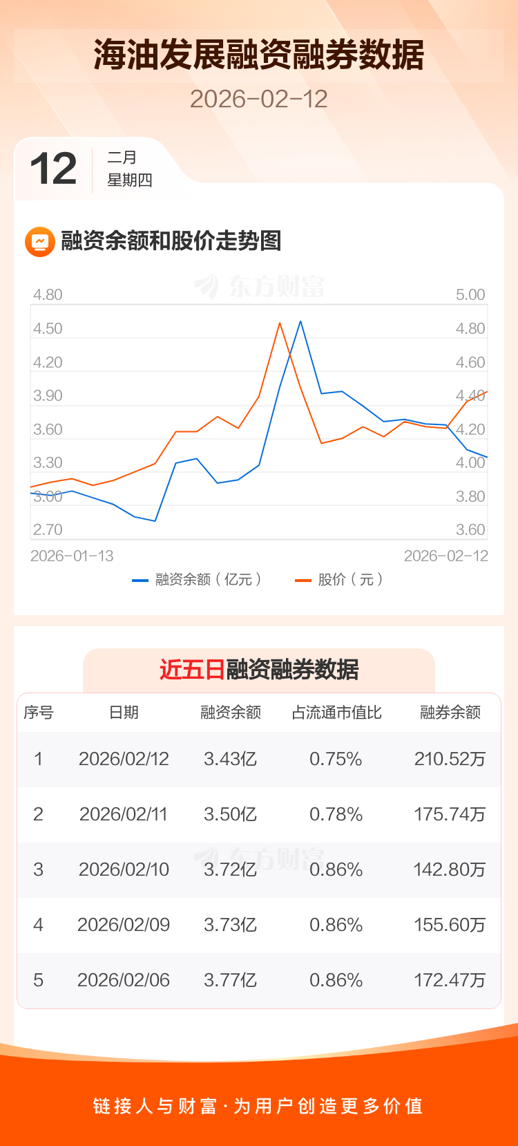 交易所最新数据显示,海油发展于2026年2月12日获融资买入4472.84万元,融资偿还5223.71万元,当日融资净偿还750.87万元。目前,该股融资余额3.43亿,占流通市值比例为0.75%。