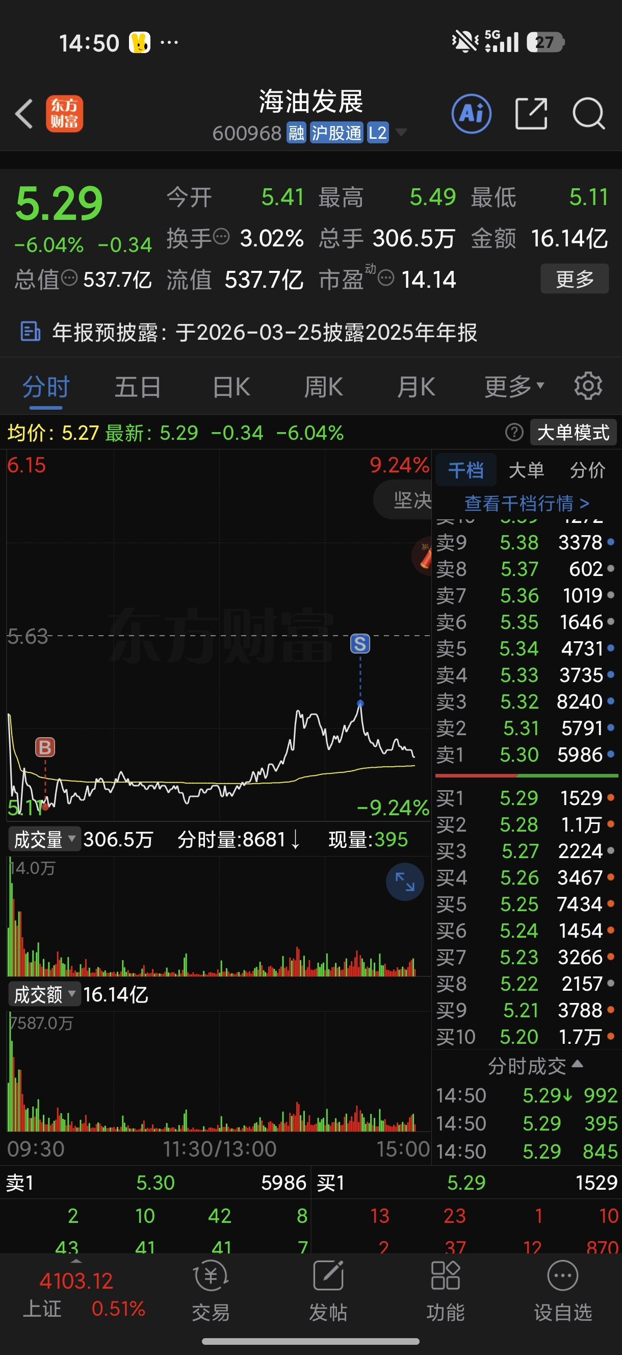 $海油发展(SH600968)$ 做t回本了。这个股太恶心,明天开盘就扔