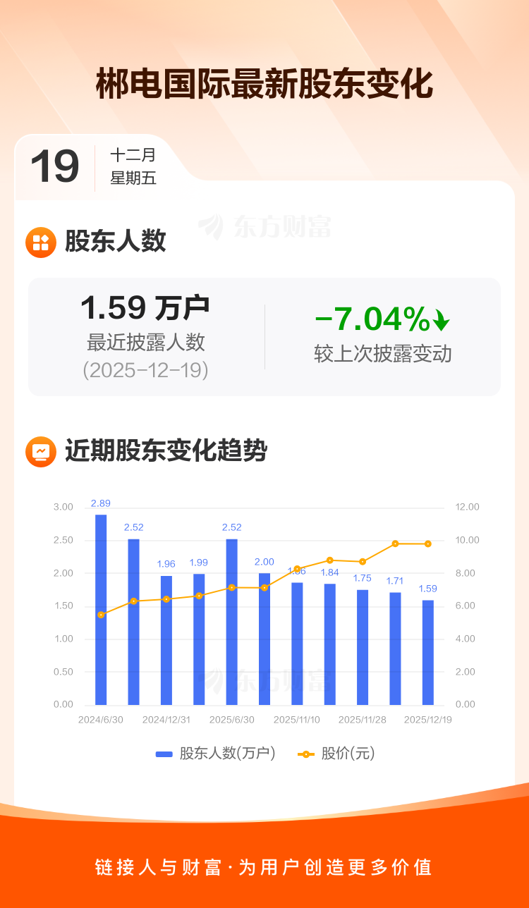 郴电国际最新披露数据显示,截至12月19日公司股东户数为1.59万户,较上期(2025年12月10日)减少1204户,降幅为7.04%。户均持有流通股数量由上期的2.16万股上升至2.33万股,户均持股金额由上期的21.21万元增加至22.79万元。