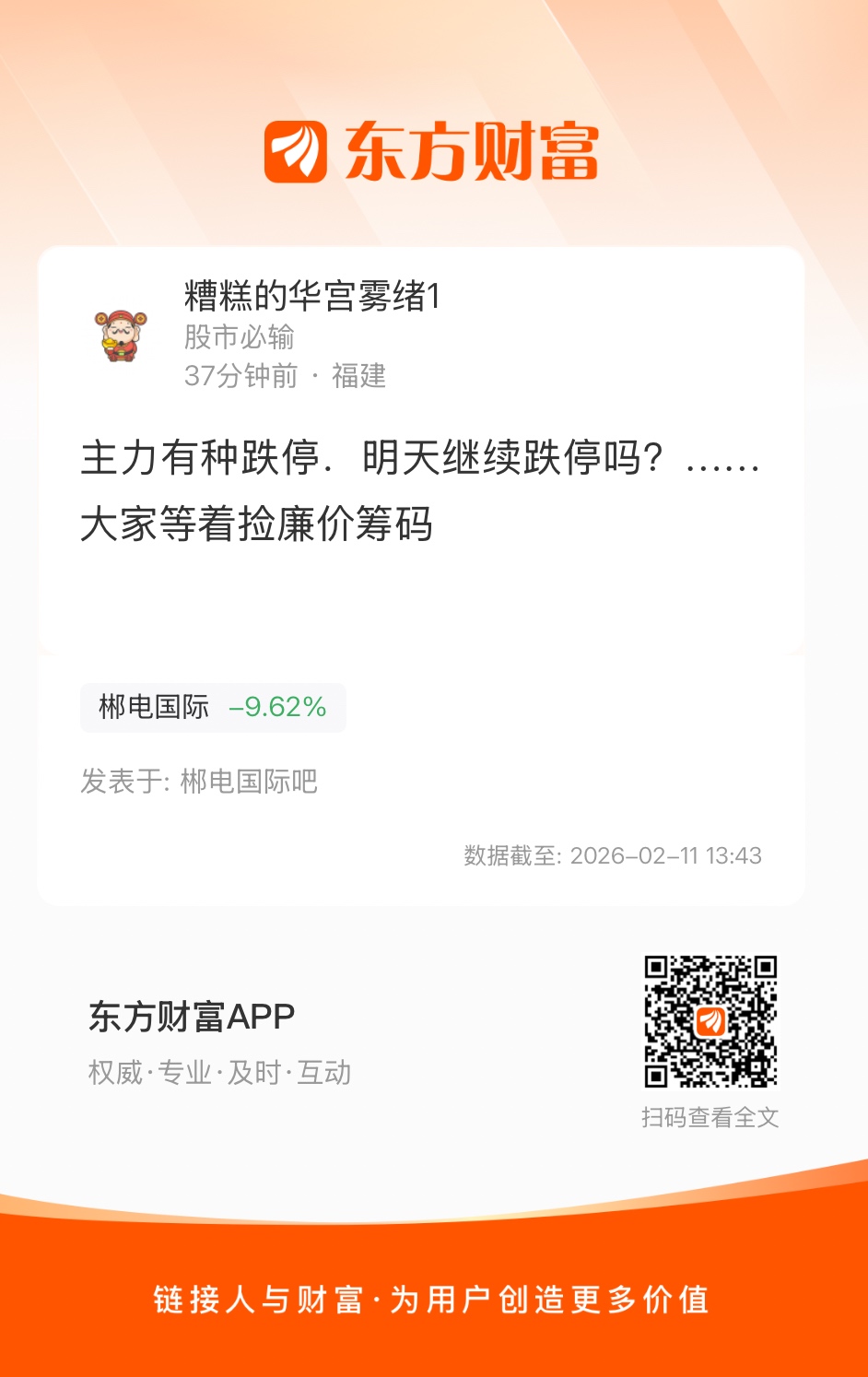 温馨提示: 1.根据《证券法》规定,禁止编造、传播虚假信息或者误导性信息,扰乱证券市场;2.用户在本社区发表的所有资料、言论等仅代表个人观点,与本网站立场无关,不对您构成任何投资建议。用户应基于自己的独立判断,自行决定证券投资并承担相应风险。《东方财富社区管理规定》