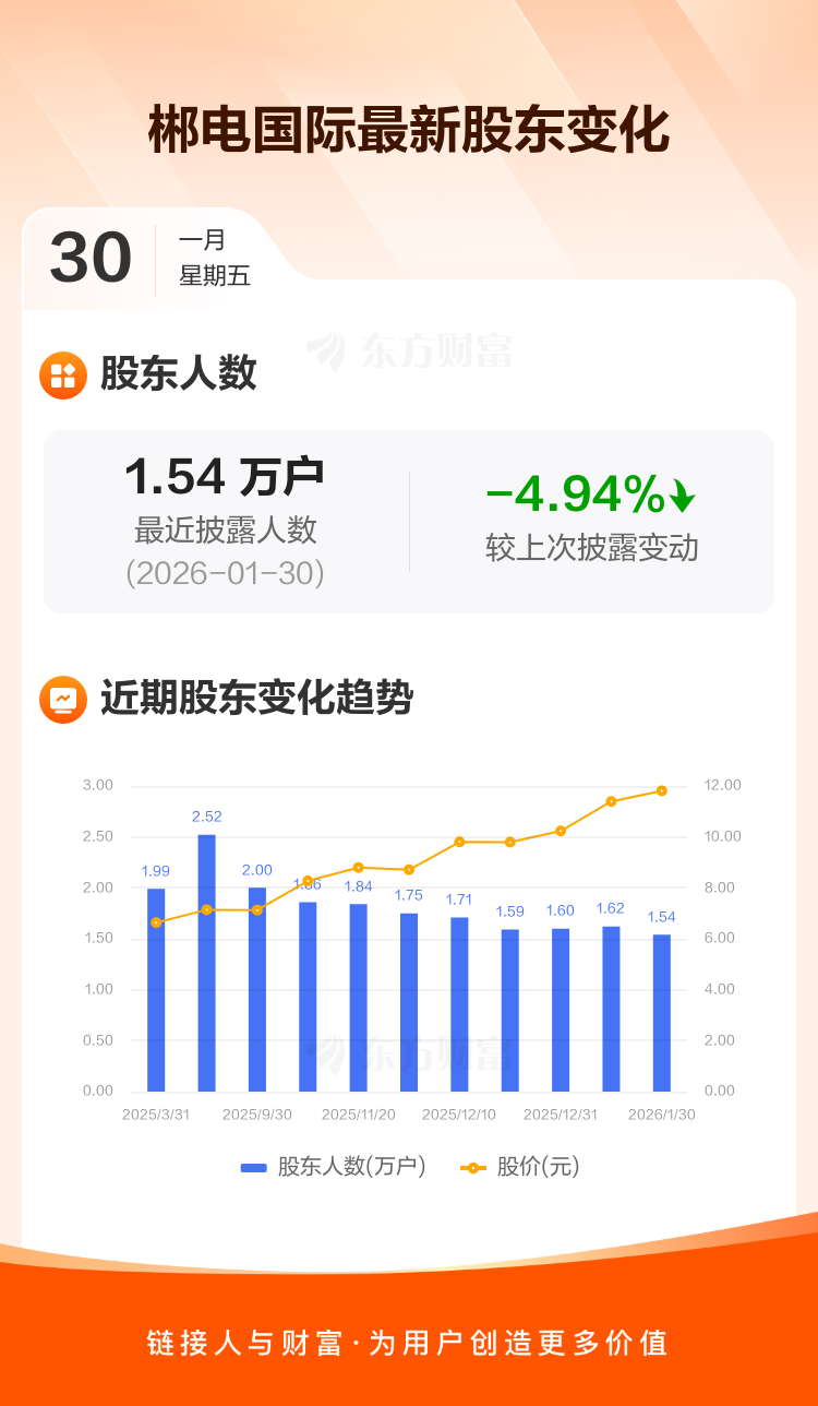 郴电国际最新披露数据显示,截至1月30日公司股东户数为1.54万户,较上期(2026年1月20日)减少798户,降幅为4.94%。户均持有流通股数量由上期的2.29万股上升至2.41万股,户均持股金额由上期的26.08万元增加至28.45万元。