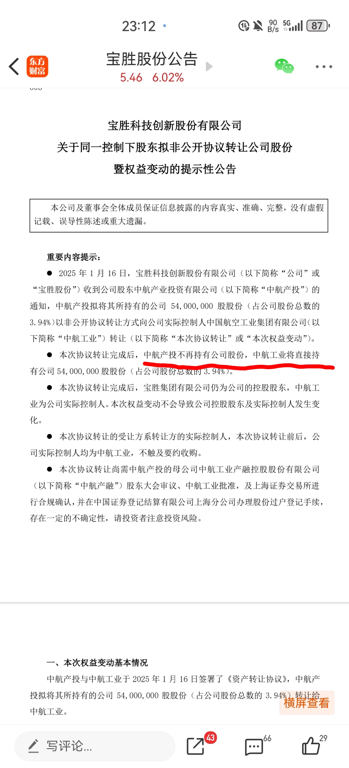 $宝胜股份(SH600973)$ 1月份的公告。中航产投是中航产融的子公司,中航产融是中航工业的子公司,宝胜原本是由中航产投控股,然后1月份就转让给中航工业了。从产融的孙子,变成了和产融的同级(比喻)。所以产融的退市,不要太担心对宝子的影响,人家中航工业为什么1月份就要了宝子的股份,看远一点。