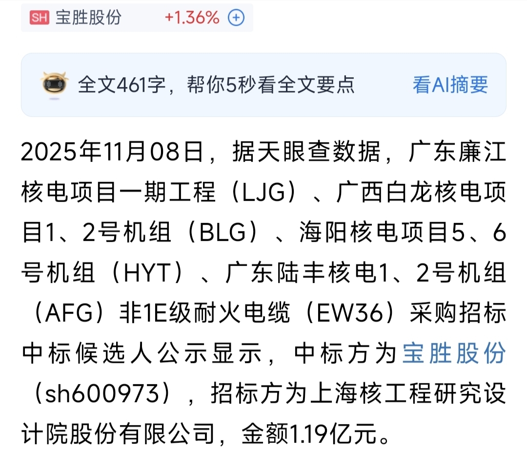 $宝胜股份(SH600973)$ 说到核电,宝胜刚刚中标一个核电小单,虽然不多,1个多亿,架不住未来滚滚而来呀
