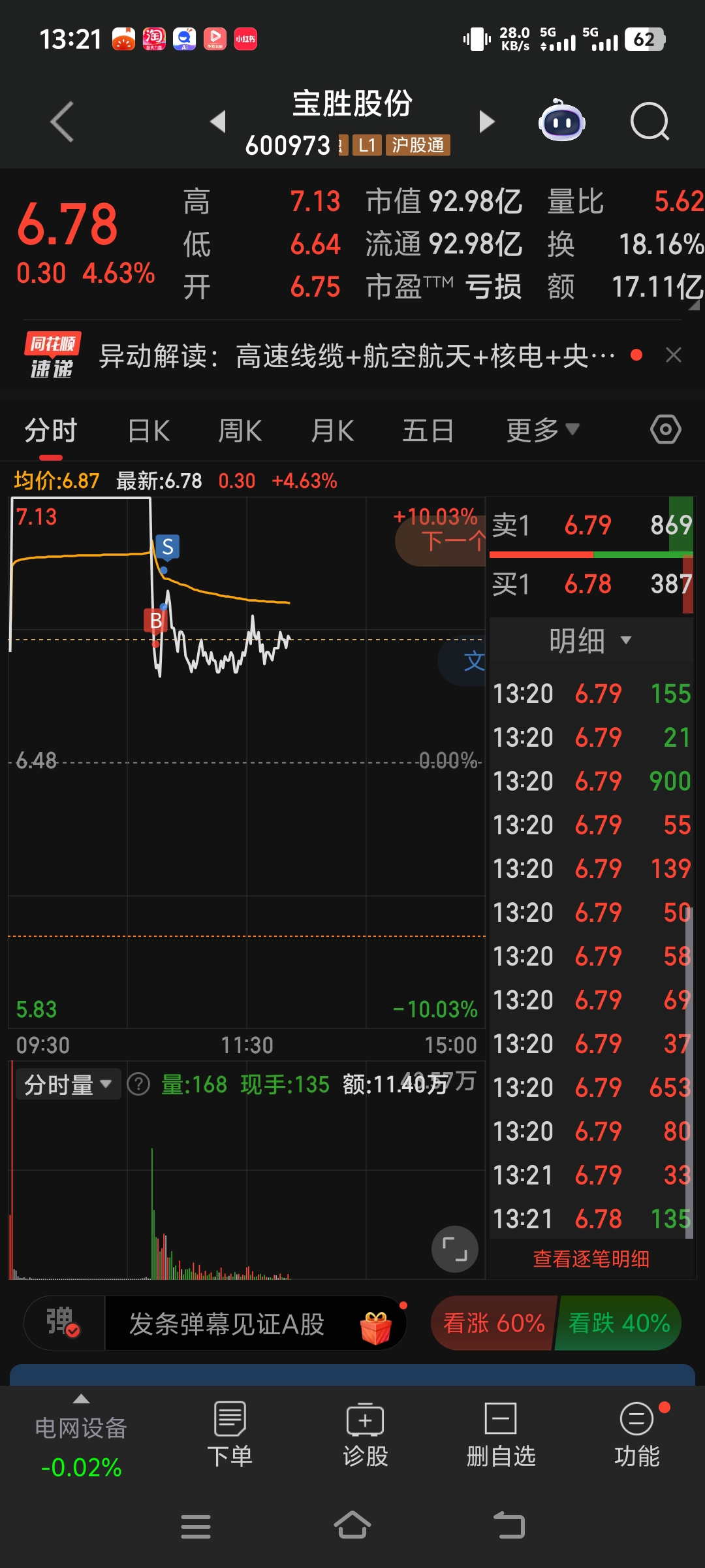 $宝胜股份(SH600973)$ 机构量化维护盘口,昨天进的板砸,今天出了一部分,剩下的格局