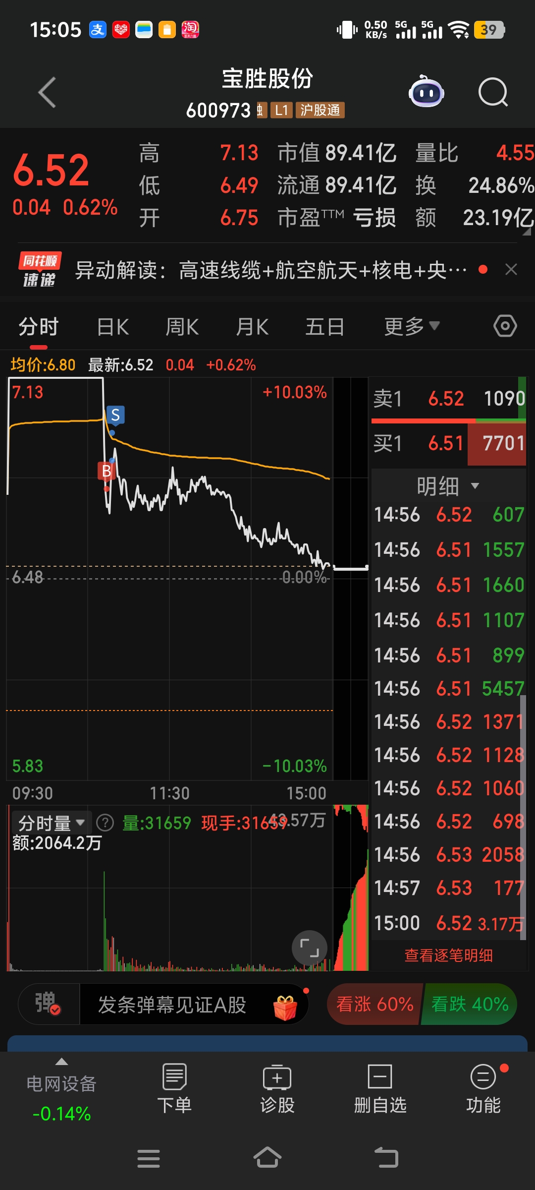 $宝胜股份(SH600973)$ 恭喜今天进来的股友,我也来陪大家吃面,