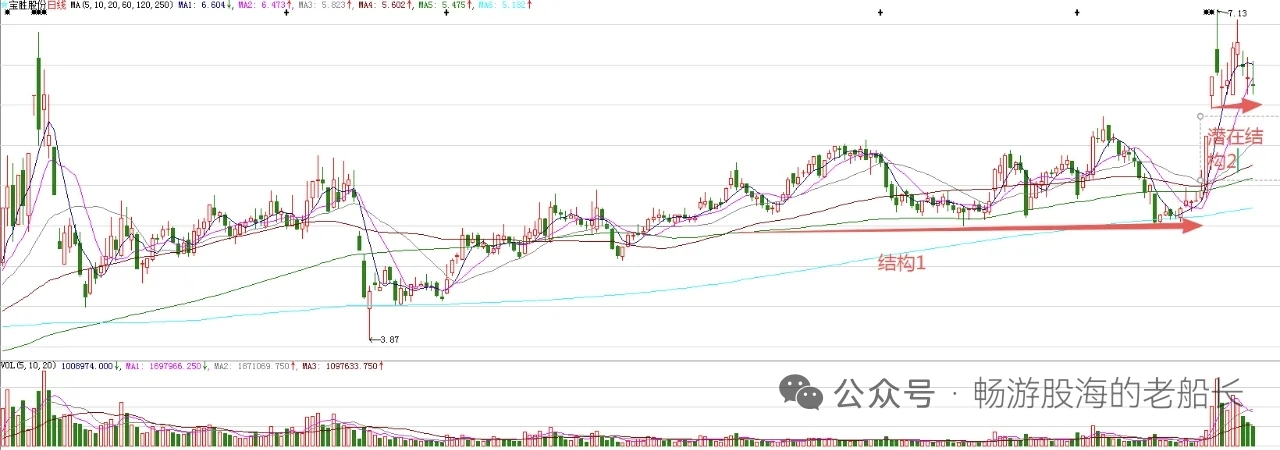 昨天走出十字星,调到了十日均线附近 ,空间到了。今天走出了上影线比较长的K线,再度释放了企稳信号,又回补了昨天的下影线,所以,周五股价大概率企稳回升,结束调整。图中标注的结构1突破,意味着股价处在上涨趋势,波段上涨开始。接下来,股价大概率还会继续波段上涨。