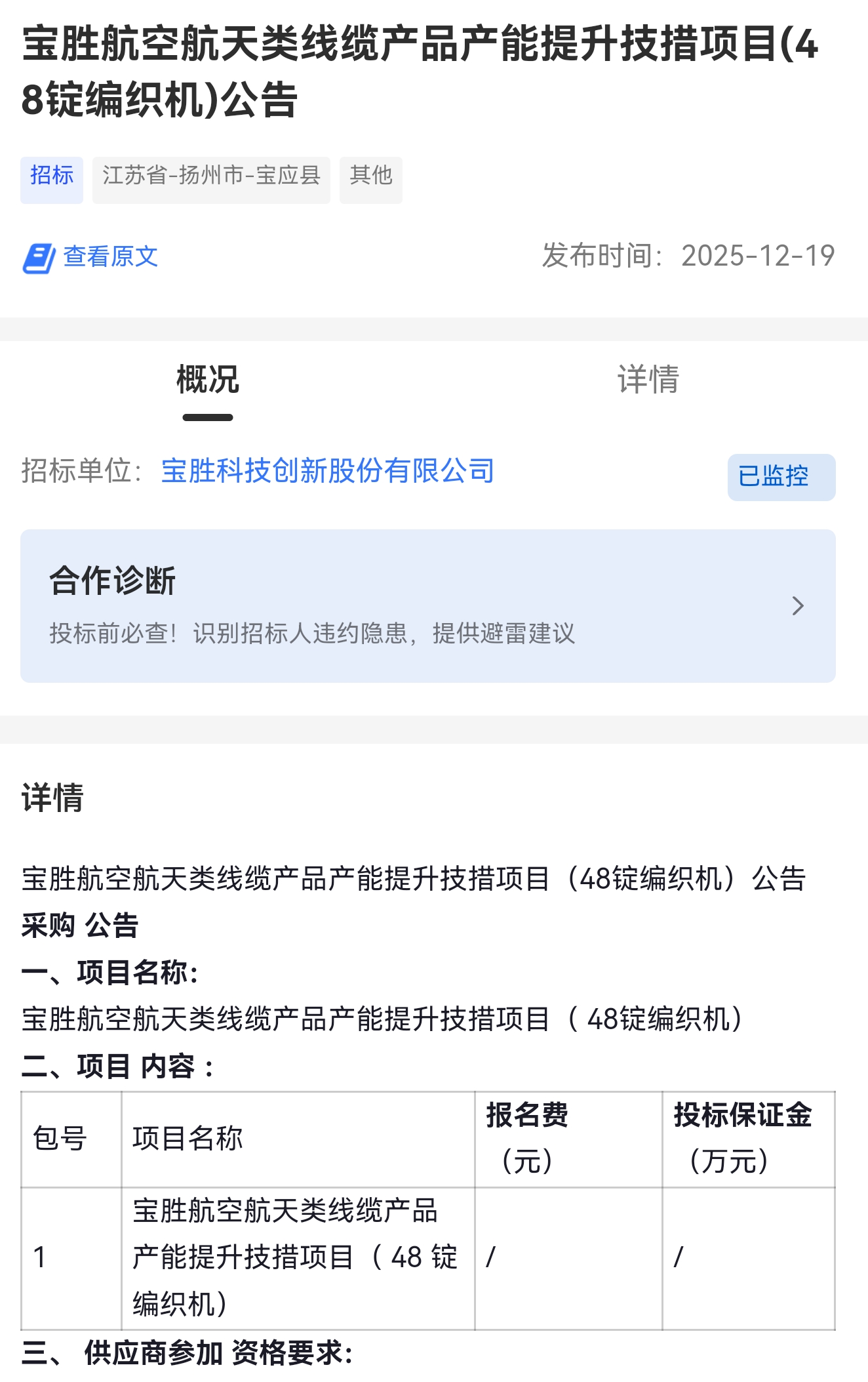 $宝胜股份(SH600973)$ 啊宝刚发的招标,航天线缆扩产了,什么情况下会扩产不用说了吧,喜欢短线暴涨的老哥们可以去华菱太阳玩玩,毕竟股价说明一切