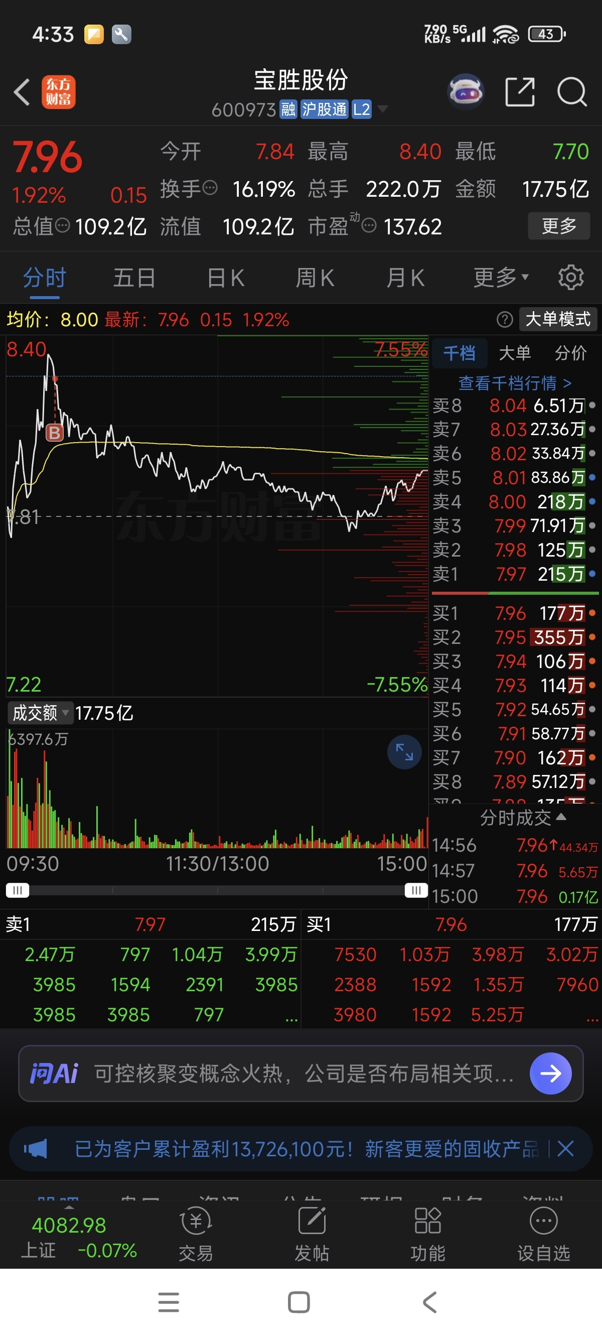 $宝胜股份(SH600973)$ 昨天涨停板打开的时候买进去今天卖出就赚钱了