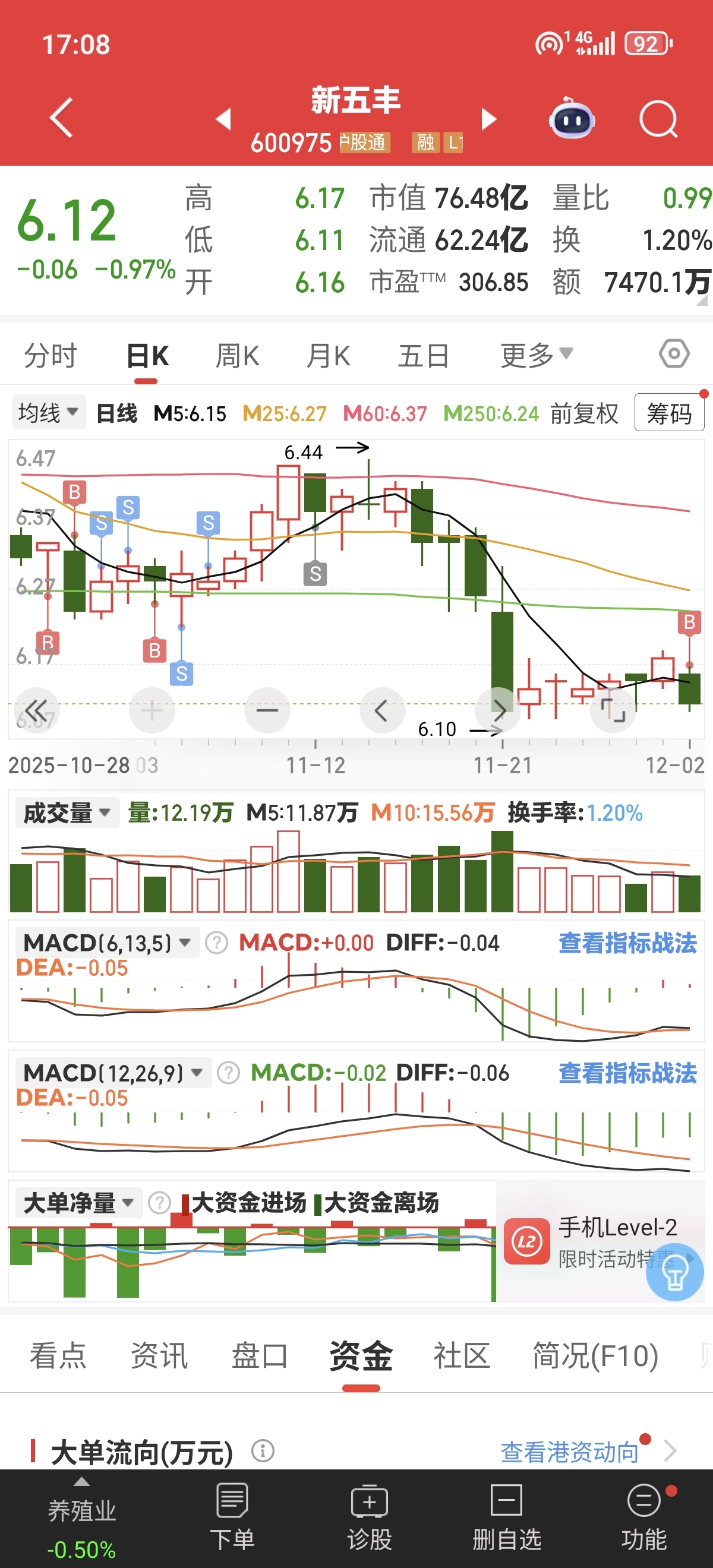 $新五丰(SH600975)$ 今天的盘面无从下手,过来套个利,不破6.10就拿着吧