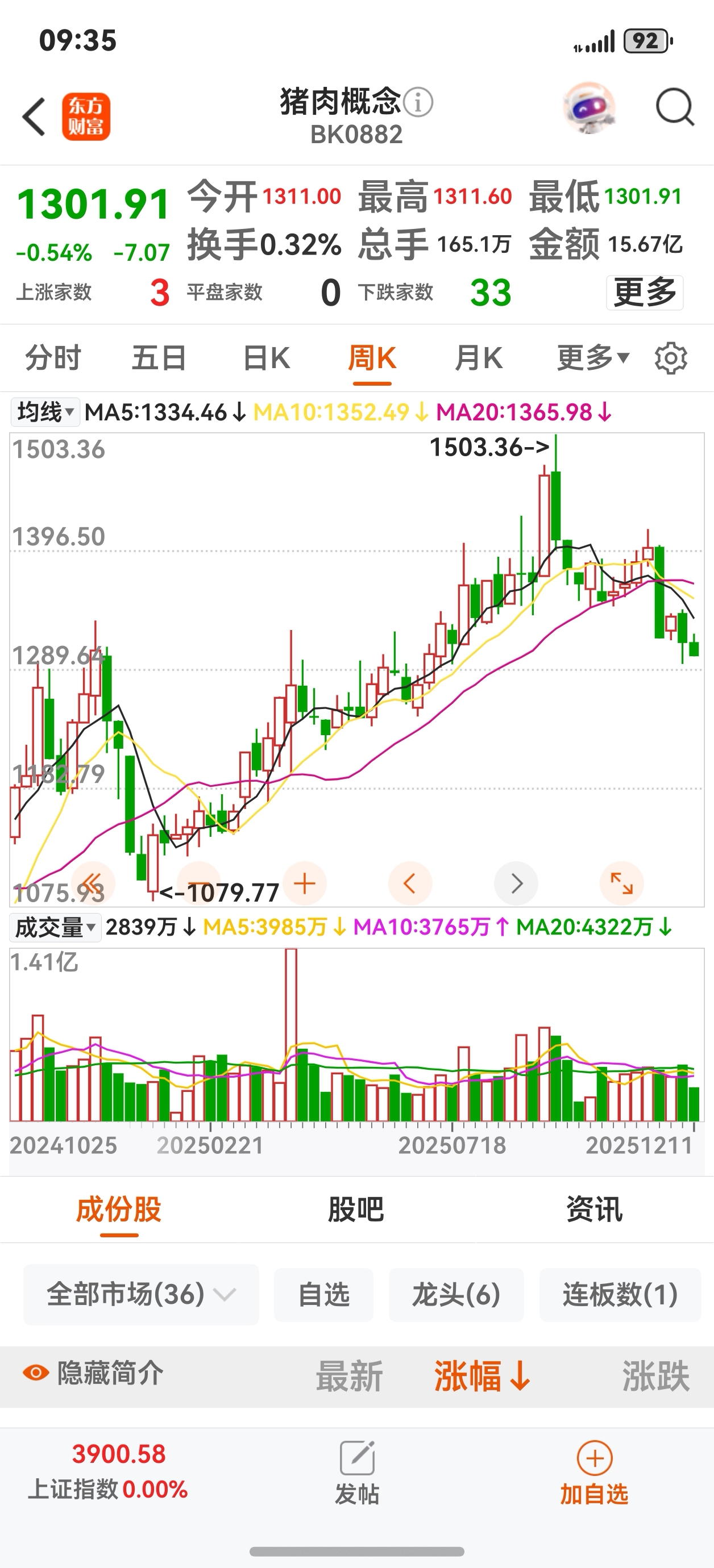 $新五丰(SH600975)$ 这就是猪肉板块的情形(还在次高位,下跌趋势中),就问你们拿着这种亏损企业的股票怕不怕,如果你认为我在唱空,你多买点就是了!