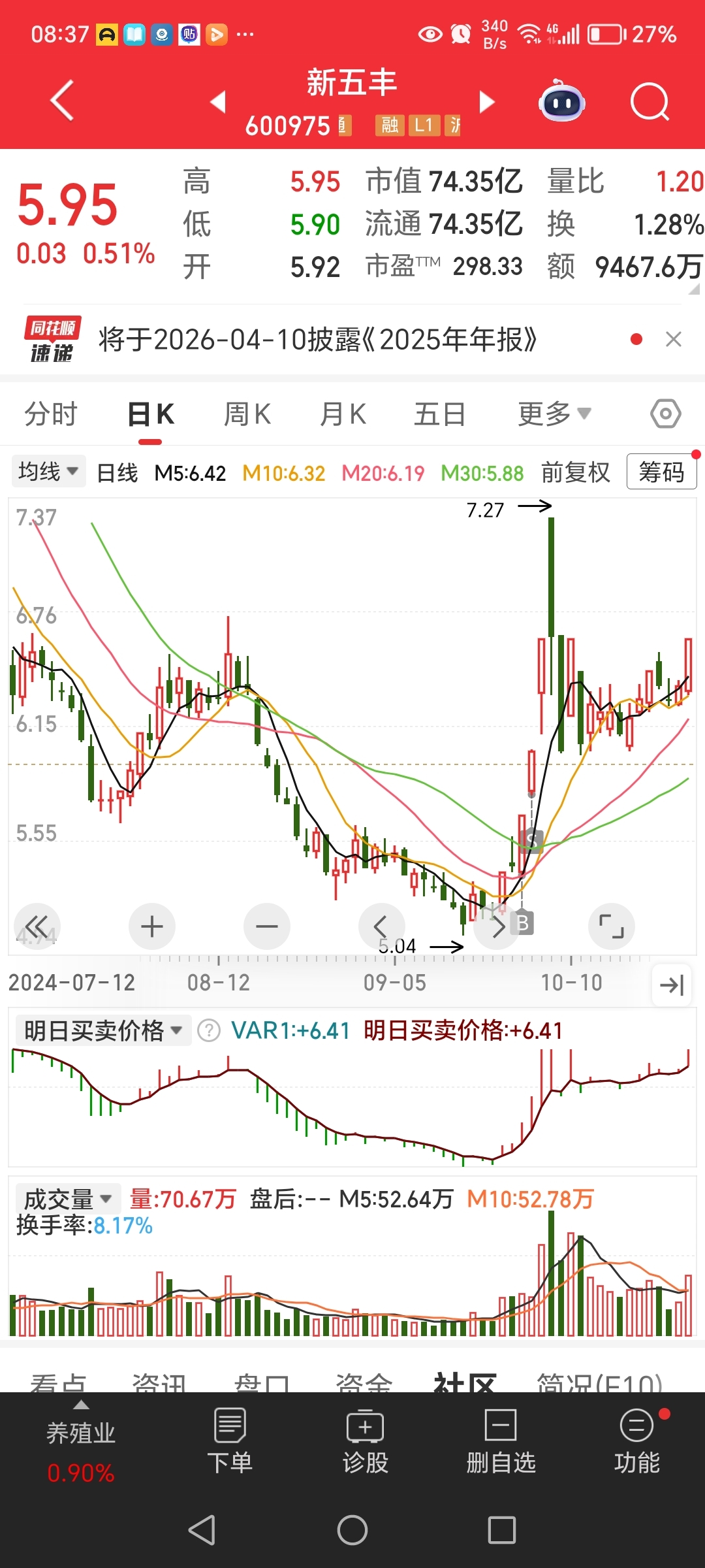 $新五丰(SH600975)$ 这个从去年9月到现在没涨啊今天买点,去年买过一次。