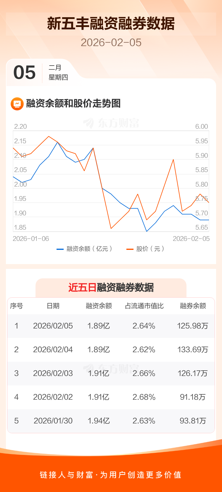 交易所最新数据显示,新五丰于2026年2月5日获融资买入454.43万元,融资偿还454.82万元,当日融资净偿还3886元。目前,该股融资余额1.89亿,占流通市值比例为2.64%。