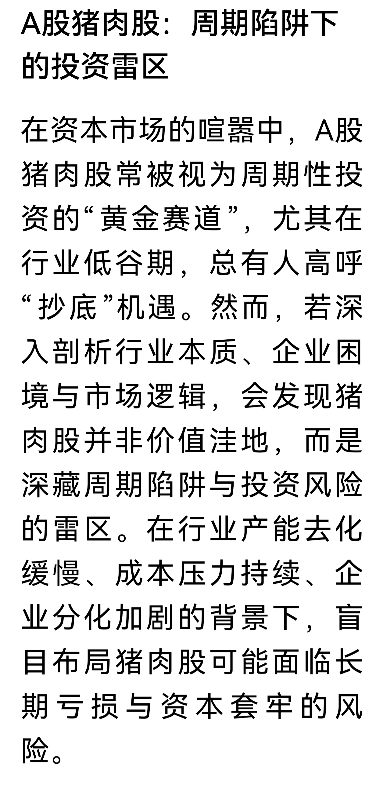 盲目布局猪肉股可能面临长期亏损与资本套牢的风险。