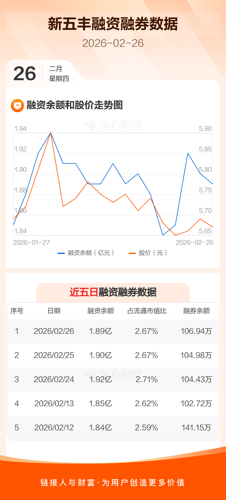 交易所最新数据显示,新五丰于2026年2月26日获融资买入291.35万元,融资偿还366.08万元,当日融资净偿还74.73万元。目前,该股融资余额1.89亿,占流通市值比例为2.67%。