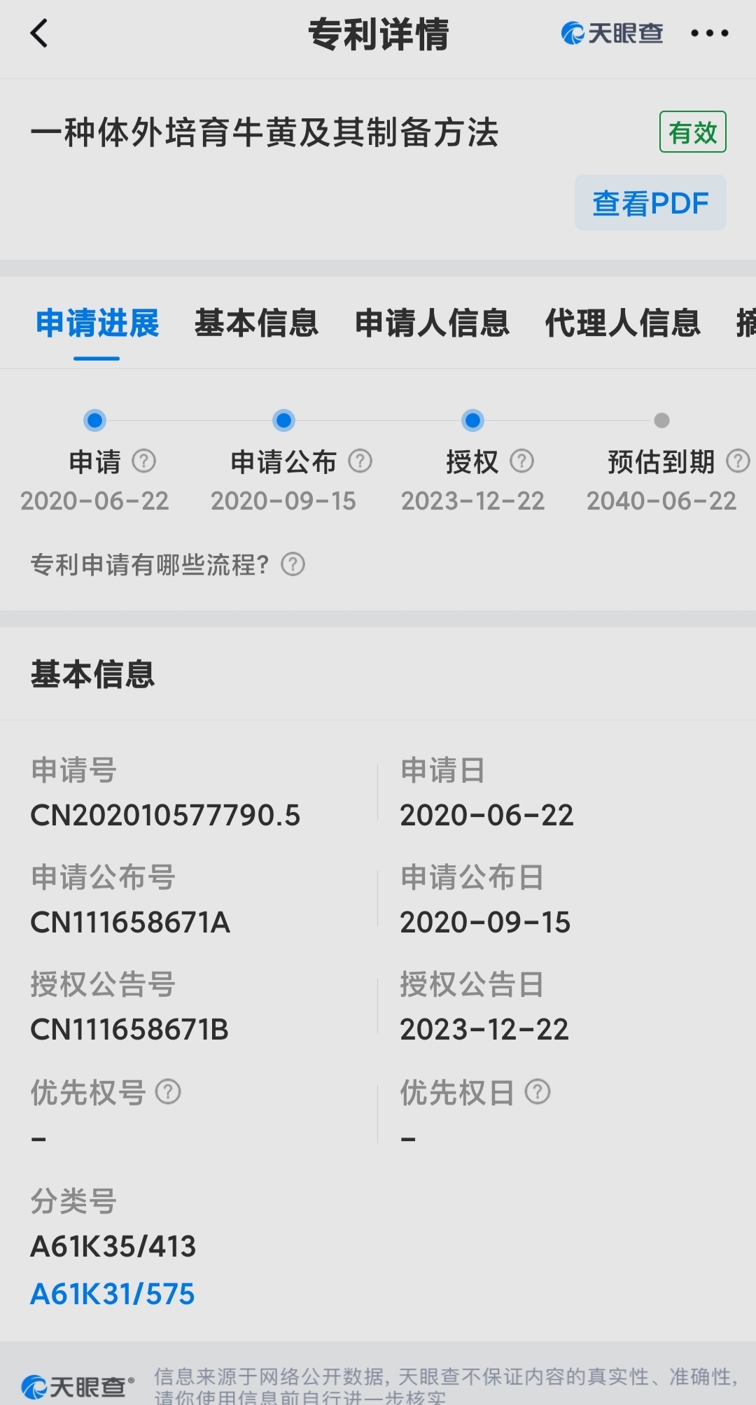 看报道体外培育牛黄的专利已过保护期,怎么天眼查上又批准了这个新专利,保护期要到2
