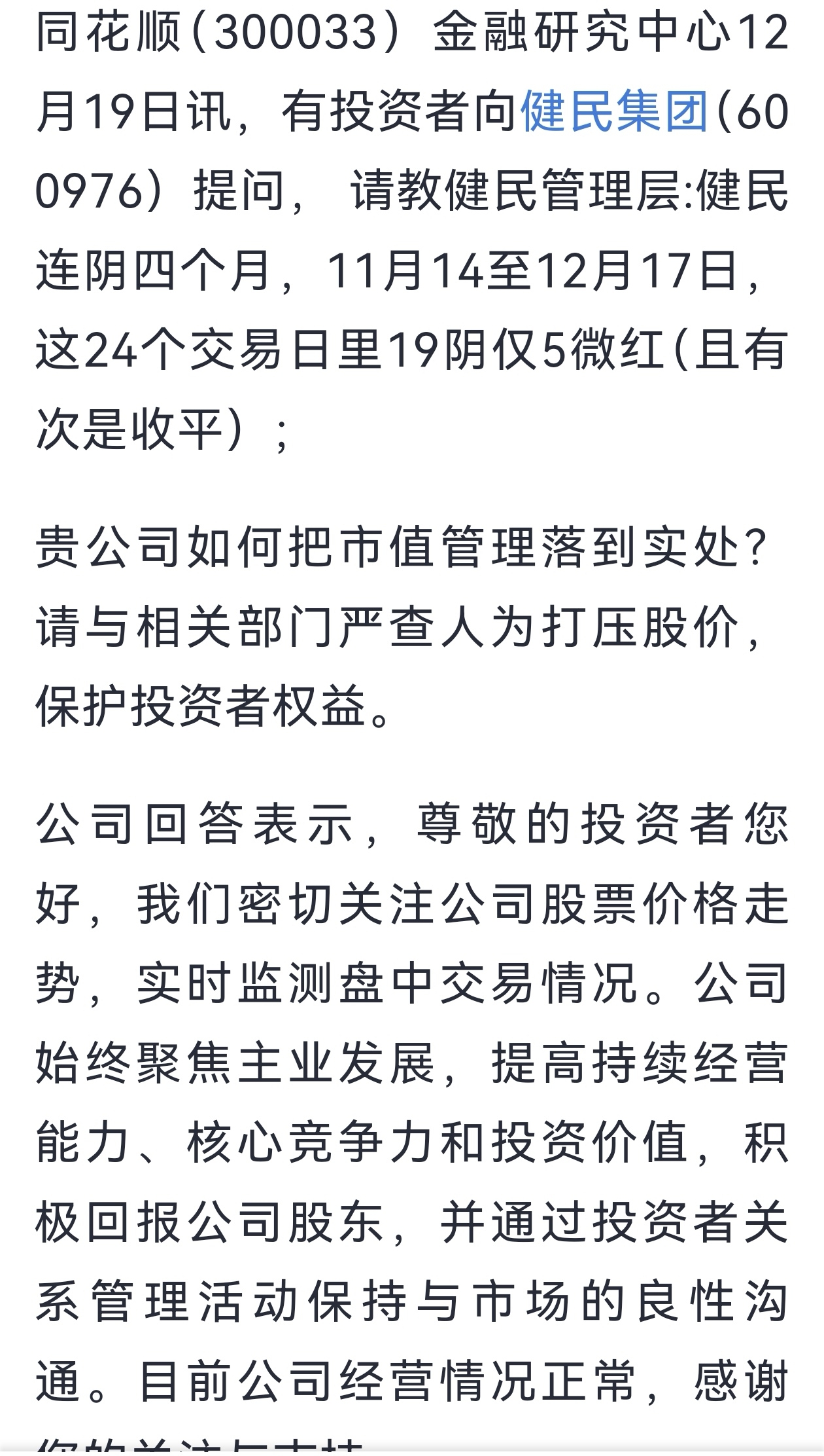 既然有密切关注与监控价格走势,此种恶意做空:为何不与相关部门严查打击、让恶意做空者承担对应法规条款的惩处?为何不再回购?光看不练这就是你们的市值管理吗?