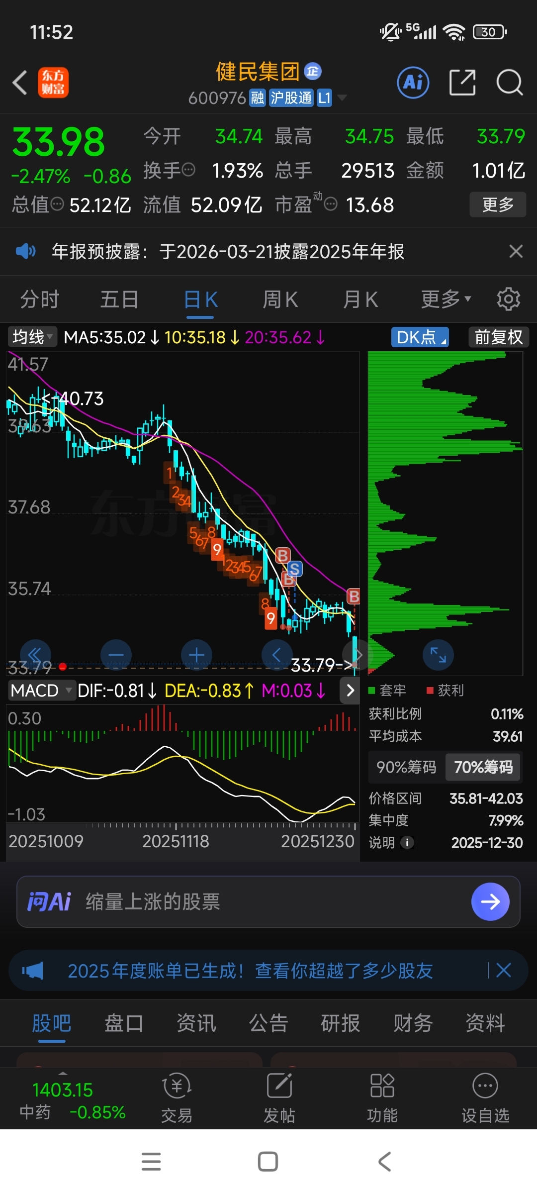$健民集团(SH600976)$ 筹码几乎没有盈利,都套死