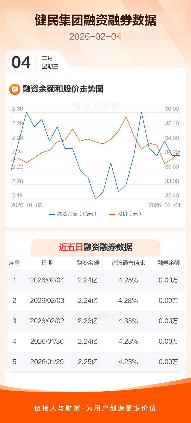 交易所最新数据显示,健民集团于2026年2月4日获融资买入305.73万元,融资偿还295.49万元,当日融资净买入10.24万元。目前,该股融资余额2.24亿,占流通市值比例为4.25%。