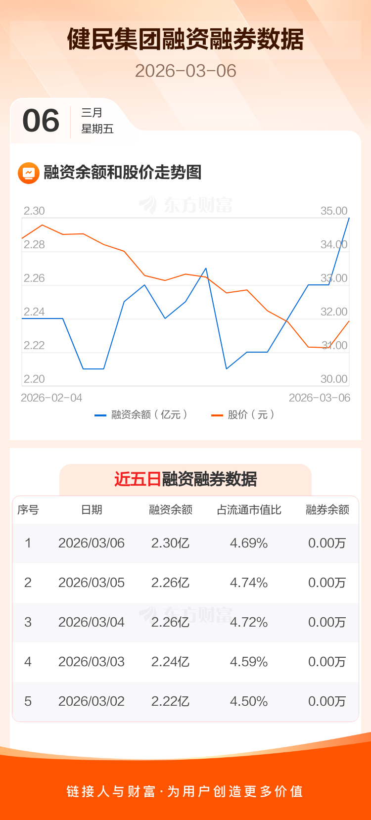 交易所最新数据显示,健民集团于2026年3月6日获融资买入666.42万元,融资偿还314.96万元,当日融资净买入351.46万元。目前,该股融资余额2.30亿,占流通市值比例为4.69%。