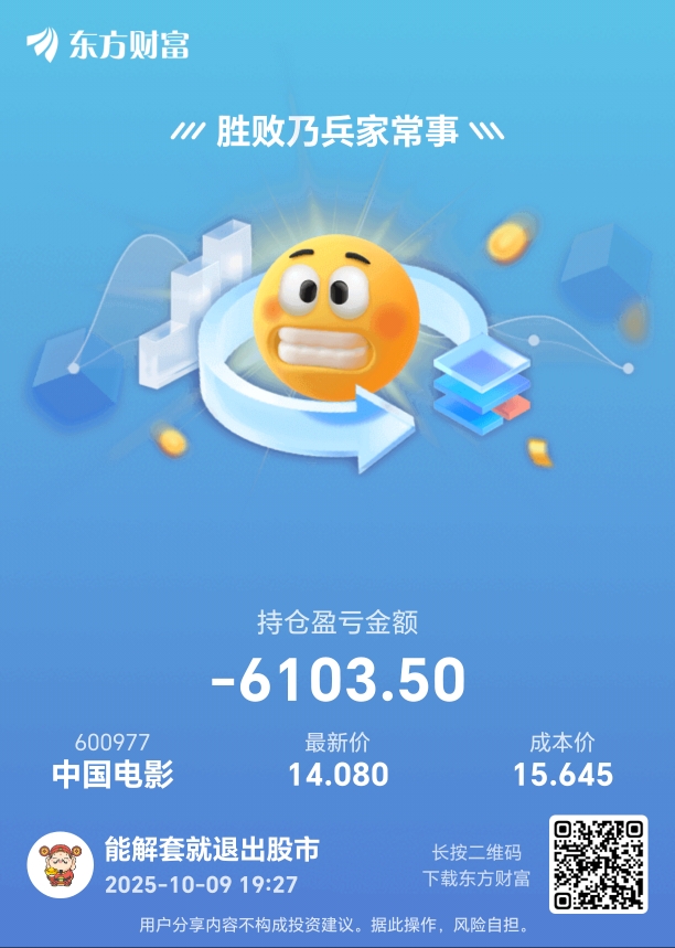 $中国电影(SH600977)$ 知道为什么大家不去看电影了吗?我今天亏了六千多,明天低开5%,我再亏2700多,加起来就亏了将近九千了。假如看一场电影要花50元,我已经亏了180次看电影的钱了。假设我一年平均看3次电影,我亏掉未来60年看电影的钱了,现在你知道我为什么不看电影了吗?