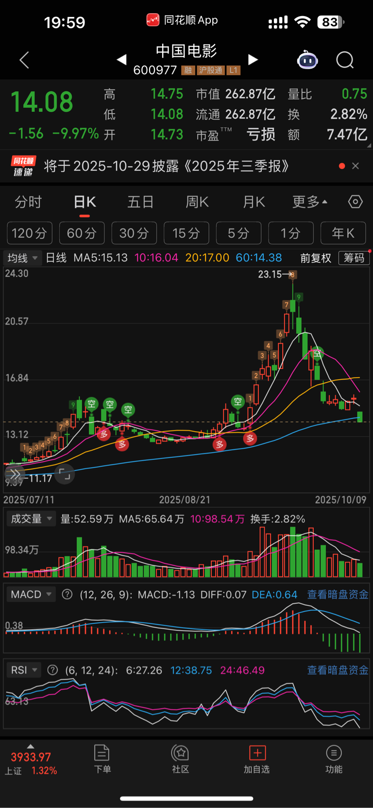 $中国电影(SH600977)$ 哪吒让一帮人挂在树梢,731又让一帮人挂在树梢。高开未必就高走,低开一定别久留。大盘如此,个股如此。涨停不卖跌停不买这是规矩哦